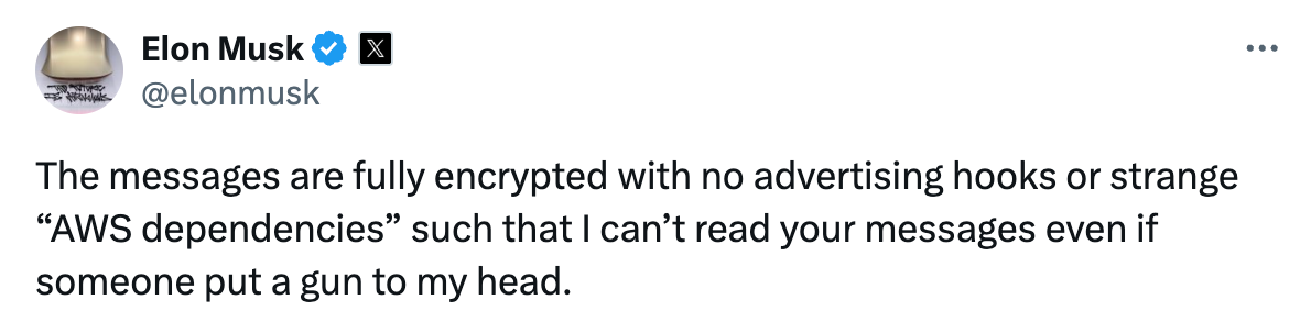 ▲ Elon 表示 X 的訊息功能不需要使用「奇怪的 AWS 依賴」。就算有人拿槍指著他,他們也看不到你的訊息。